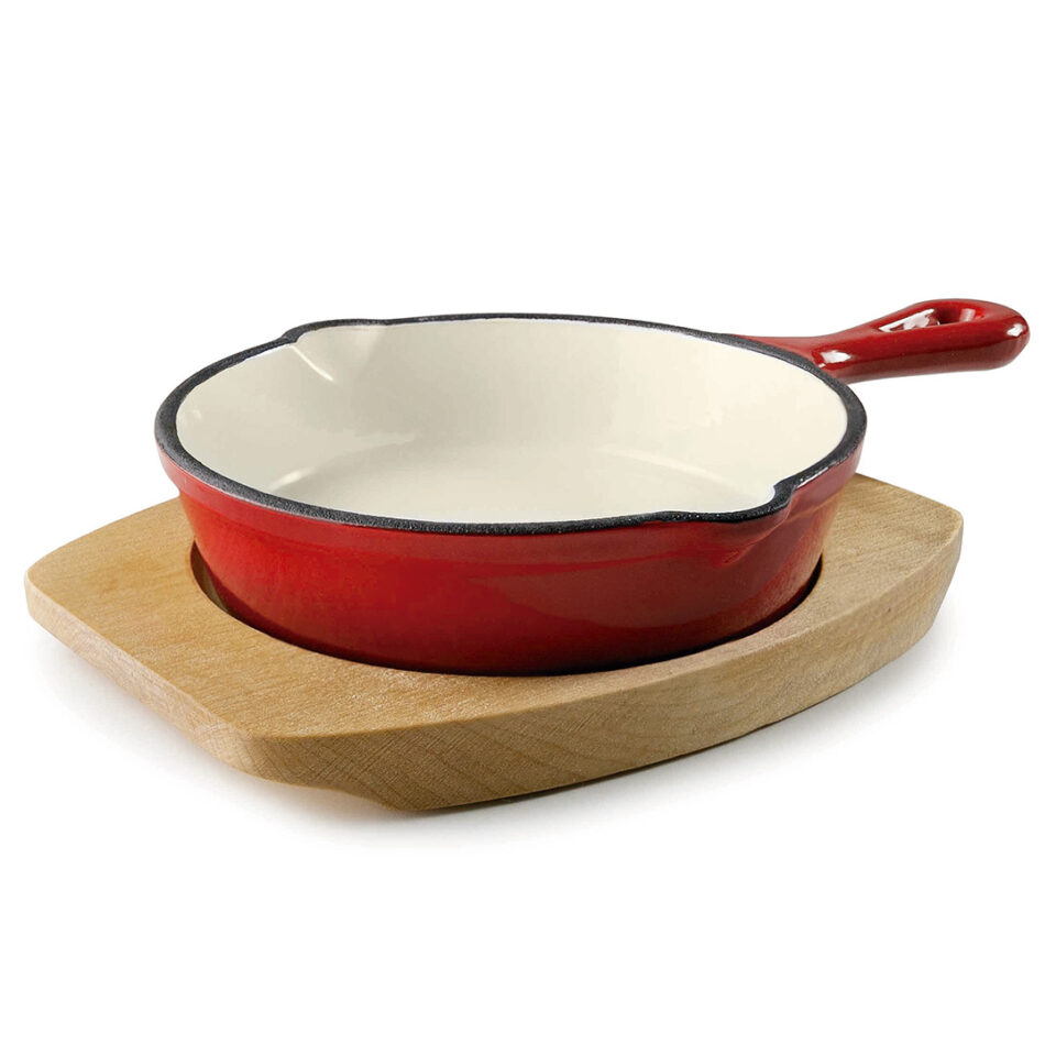 Пательня чавунна емальована кругла d-13,5 см на дерев’яній підставці