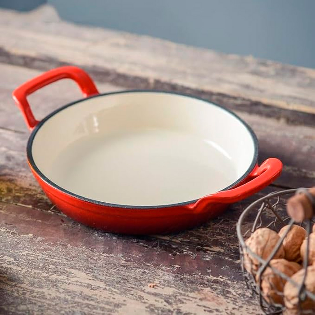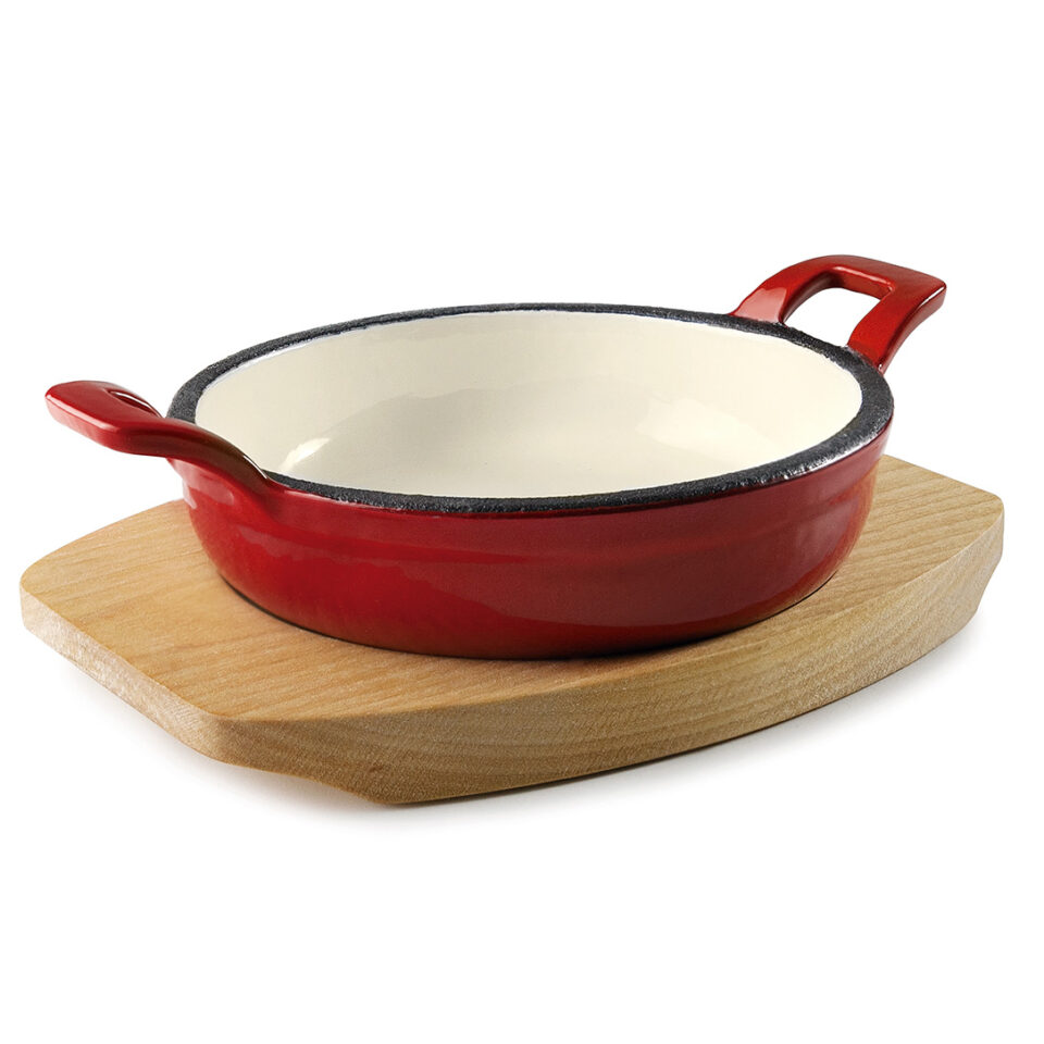 Пательня чавунна емальована з двома ручками d-12 см на дерев’яній підставці